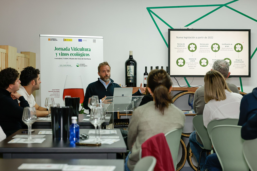 Juan Carlos Sancha, doctor en Viticultura y Enología, ha defendido la viticultura ecológica como “la más sostenible en el futuro y hacia dónde tenemos que caminar todos” en la jornada “Viticultura y vinos ecológicos”, organizada por la Denominación de Origen Cariñena para tratar las características y beneficios de los productos certificados con este sello, y las oportunidades que ofrece en un escenario en el que los alimentos ecológicos cada vez tienen más demanda en el mercado internacional.