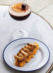 torrezno a baja temperatura con patata revolcona, armonizado con el cóctel Sweet Blood