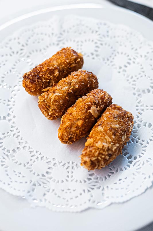 La propuesta incluye entrantes para compartir en el que las croquetas —de jamón ibérico de bellota (D.O. Guijuelo) y de pollo asado— abren el apetito junto a la berenjena en tempura con hilo de miel, otra de las propuestas clásicas de La Venta, o el lacón cortado fino con pimentón de La Vera, acompañado de pan con tomate.