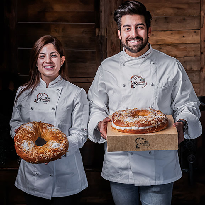 Roscón de Reyes de Viena La Baguette: Y no podemos finalizar esta selección de dulces navideños sin un buen roscón de Reyes. En este caso os sugerimos los roscones de Viena La Baguette (Puerto de Tornavacas, 5, Leganés, Madrid. Tel.: 915 600 922) porque los elaboran de forma 100% natural y tradicional, con harinas limpias, sin aditivos, con una alta cantidad de proteína, masa madre, y la mejor agua de azahar. Y un año más, llega ‘relleno’ de novedades gracias a la creatividad de Maca Fernández –5ª generación de la firma centenaria junto a su hermano Fran–, la hija pastelera de Paco, que pone el toque dulce en este obrador centenario. El año pasado la joven sorprendió con un relleno de caramelos de violeta, y este año, su propuesta más especial ¡sabe a tarta de queso! Por supuesto se mantienen sus tres clásicos: el de nata y el de trufa, junto al tradicional de toda la vida sin relleno. Todos ellos caracterizados por ser superesponjosos, aromáticos -con el toque de agua de azahar perfecto- y coronados con almendras, azúcar y naranja confitada. Cualquiera de ellos hay que encargarlo con 24 horas de antelación.
